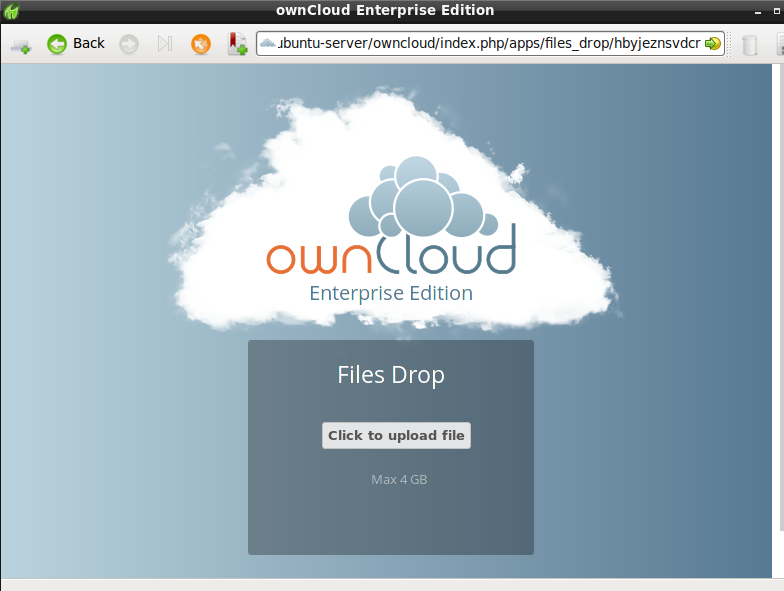 Using the Files Drop app is simple. You receive a link to the upload folder, click the link, and then you’ll see an ownCloud page with a Click to upload button.